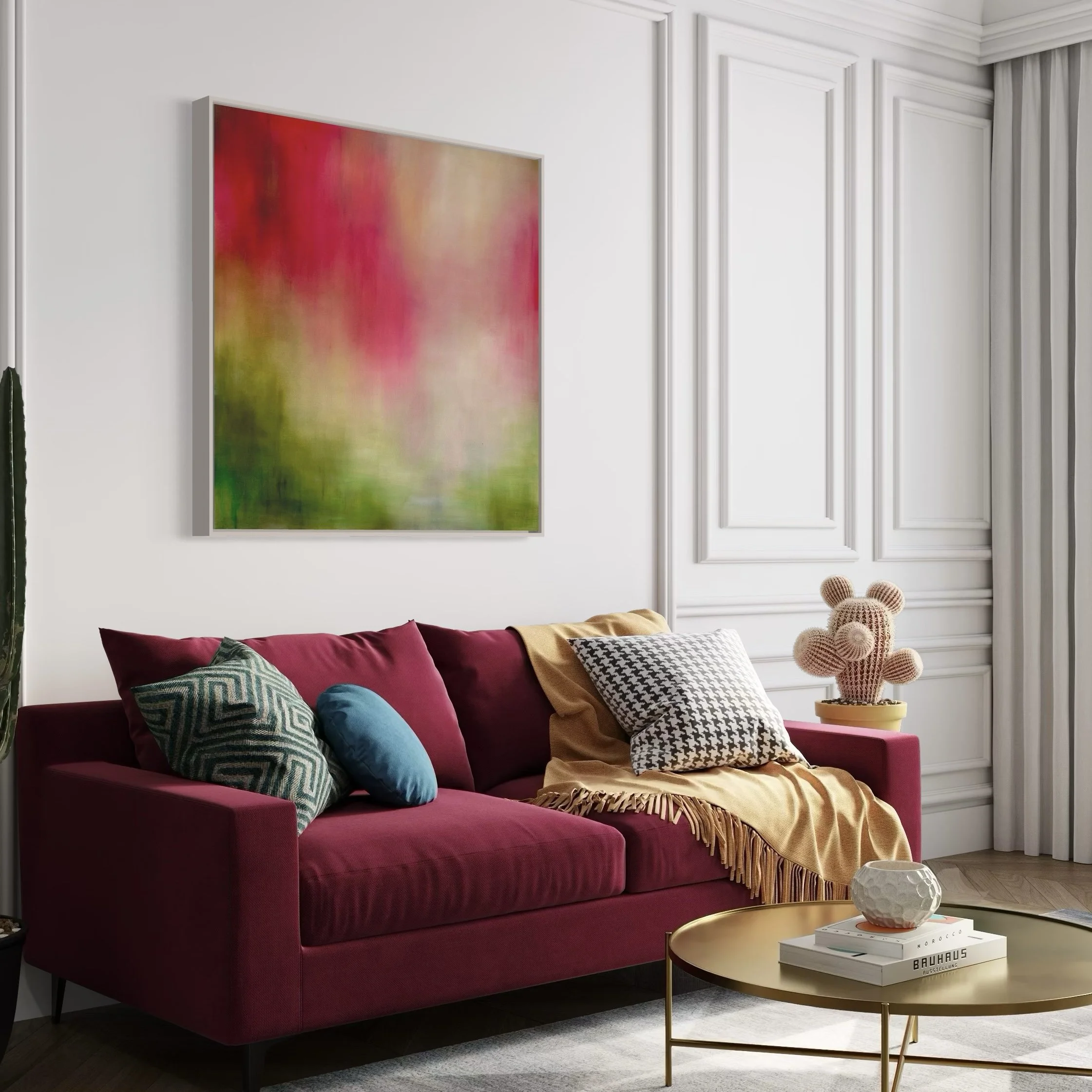 Framed in a custom limewashed timber frame, measuring 96 × 96 × 6cm